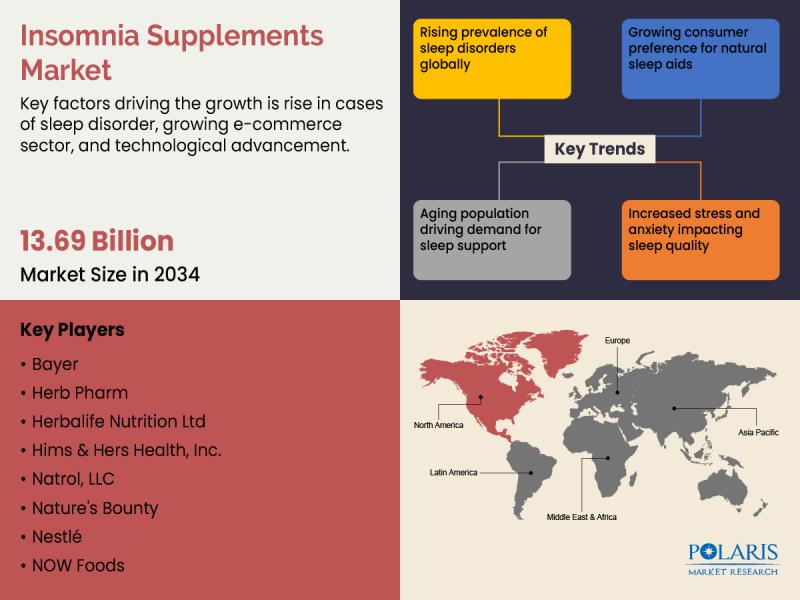 Global Insomnia Supplements Market is currently valued at USD 4.02 Billion in 2024 and is anticipated to generate an estimated revenue of USD 13.69 Billion by 2034, according to the latest study by Polaris Market Research. Besides, the report notes that the market exhibits a robust 13.1% Compound Annual Growth Rate (CAGR) over the forecasted timeframe, 2025 - 2034