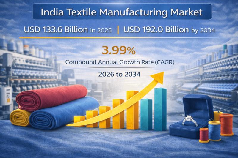 According to IMARC Group's report titled "India Textile Manufacturing Market Size, Share, Trends and Forecast by Process Type, Textile Type, Equipment and Machinery, and Region, 2026-2034" the report offers a comprehensive analysis of the industry, including market share, growth, trends, and regional insights.