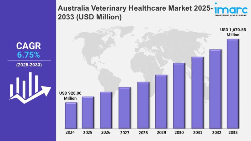 The latest report by IMARC Group, "Australia Veterinary Healthcare Market Size, Share, Trends and Forecast by Product, Animal Type, End User, and Region, 2025-2033, offers a comprehensive analysis of the Australian veterinary healthcare market's growth.The report also includes competitor and regional analysis, along with a breakdown of segments within the industry. The Australian veterinary healthcare market size reached USD 928.00 million in 2024. Looking forward, IMARC Group expects the market to reach USD 1,670.55 million by 2033, exhibiting a growth rate (CAGR) of 6.75% during 2025-2033.