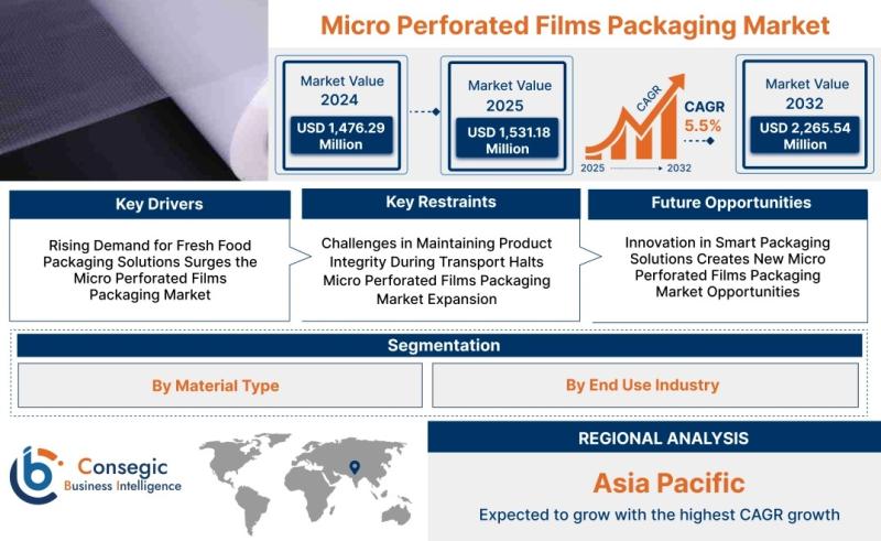 The Micro Perforated Films Packaging Market size is estimated to reach over USD 2,265.54 Million by 2032 from a value of USD 1,476.29 Million in 2024 and is projected to grow by USD 1,531.18 Million in 2025, growing at a CAGR of 5.5% from 2025 to 2032.