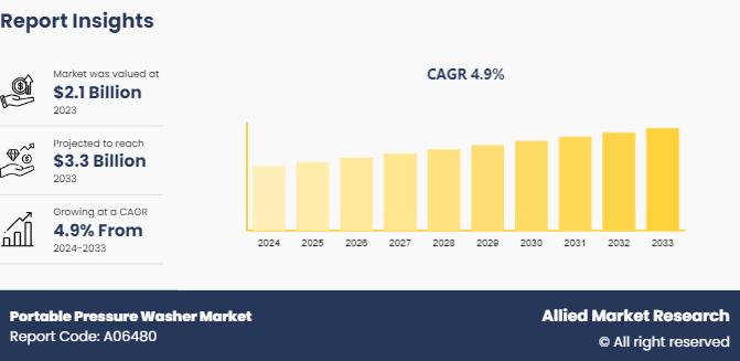 The global portable pressure washer market was valued at $2.1 billion in 2023, and is projected to reach $3.3 billion by 2033, growing at a CAGR of 4.9% from 2024 to 2033. Portable pressure washers are compact mobile devices designed to deliver high-pressure water streams for cleaning various surfaces such as vehicles, outdoor equipment, decks, and driveways. These units are typically lightweight, easy to transport, and operate using electric or…
