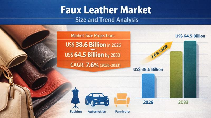 The global faux leather market is witnessing substantial growth as industries shift toward sustainable and cost-effective alternatives to genuine leather. According to the latest study by Persistence Market Research, the market is projected to expand from US$ 38.6 billion in 2026 to US$ 64.5 billion by 2033, registering a CAGR of 7.6% during the forecast period. Faux leather, also known as synthetic leather, is widely used across industries such as…