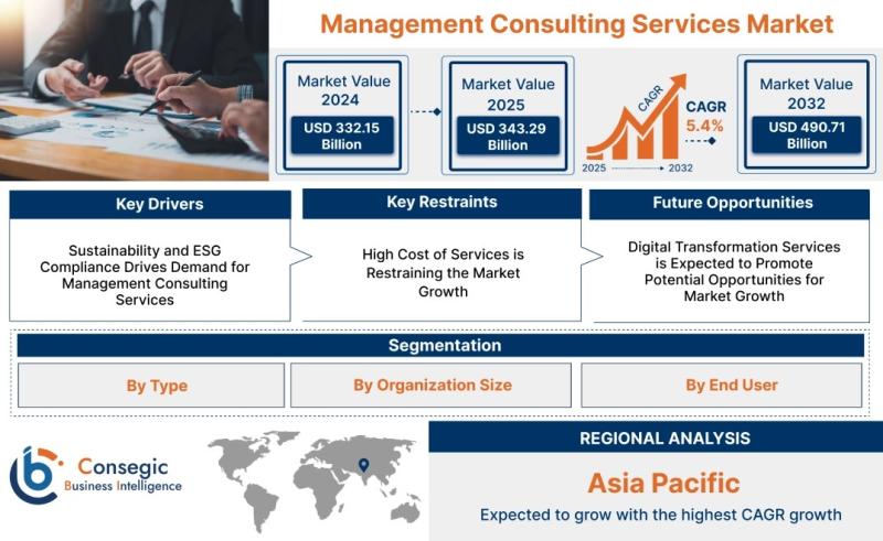 The Management Consulting Services Market size is estimated to reach over USD 490.71 Billion by 2032 from a value of USD 332.15 Billion in 2024. It is projected to grow by USD 343.29 Billion in 2025, growing at a CAGR of 5.4% from 2025 to 2032.