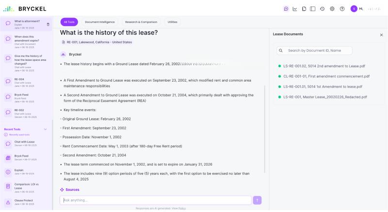 Bryckel is a modern AI technology platform built for commercial real estate professionals. It offers property and asset managers of retail, office and multifamily assets AI lease abstraction, central secure hub for lease intelligence and AI CRE tools such as LOI to lease comparison, lease risk assessment, offfering memo analysis and more.