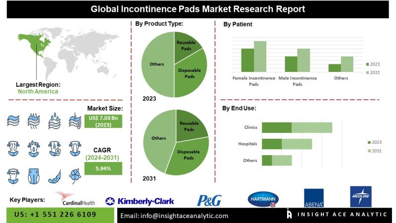 InsightAce Analytic Pvt. Ltd. announces the release of a market assessment report on the "Global Incontinence Pads Market- (By Product Type (Reusable Pads, Disposable Pads), By Patient (Female Incontinence Pads, Male Incontinence Pads), By End-Use (Hospitals, Clinics, Long-term Care Facilities, Homecare Settings, Others), By Distribution Channel (Offline Sales, Hospital Pharmacies, Retail Pharmacies, Hypermarkets and Supermarkets, Online Sales)), Trends, Industry Competition Analysis, Revenue and Forecast To 2031."