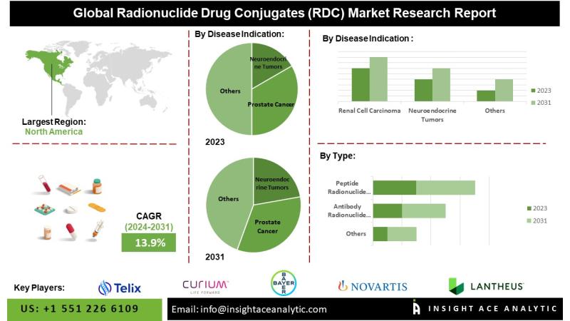 InsightAce Analytic Pvt. Ltd. announces the release of a market assessment report on the "Global Radionuclide Drug Conjugates (RDCs) Market Size, Share & Trends Analysis Report By Type (Antibody Radionuclide Conjugates (ARC), Peptide Radionuclide Conjugates (PRC), Small Molecular Radionuclide Conjugates (SMRC)), Disease Indication (Neuroendocrine Tumors, Prostate Cancer, Renal Cell, Carcinoma, Others)- Market Outlook And Industry Analysis 2031"