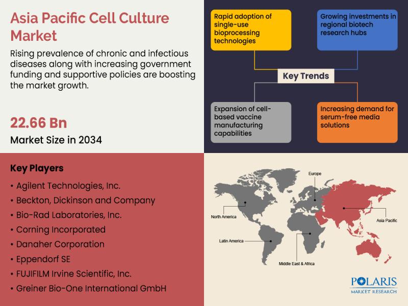 Asia Pacific Cell Culture Market is currently valued at USD 6.06 Billion in 2024 and is anticipated to generate an estimated revenue of USD 22.66 Billion by 2034, according to the latest study by Polaris Market Research. Besides, the report notes that the market exhibits a robust 14.1% Compound Annual Growth Rate (CAGR) over the forecasted timeframe, 2025 - 2034.