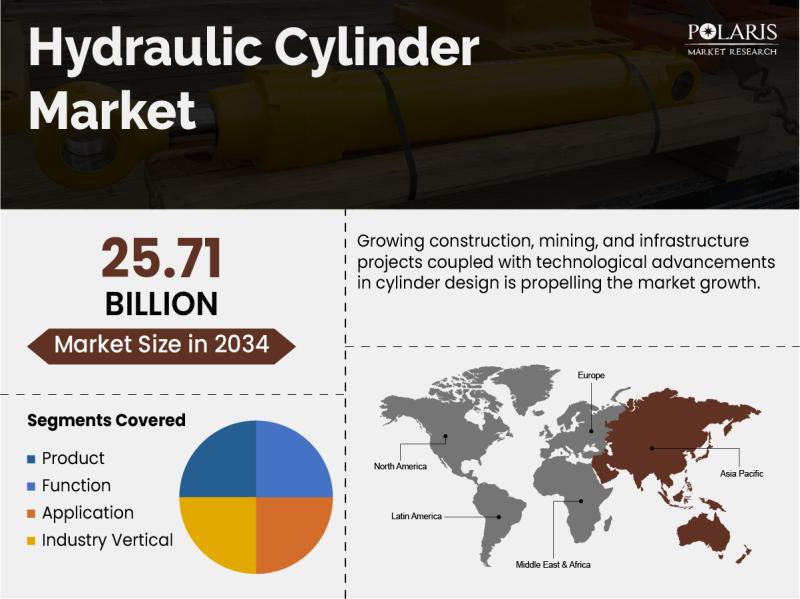 Global Hydraulic Cylinder Market is currently valued at USD 16.80 Billion in 2024 and is anticipated to generate an estimated revenue of USD 25.71 Billion by 2034, according to the latest study by Polaris Market Research. Besides, the report notes that the market exhibits a robust 4.36% Compound Annual Growth Rate (CAGR) over the forecasted timeframe, 2025 - 2034.