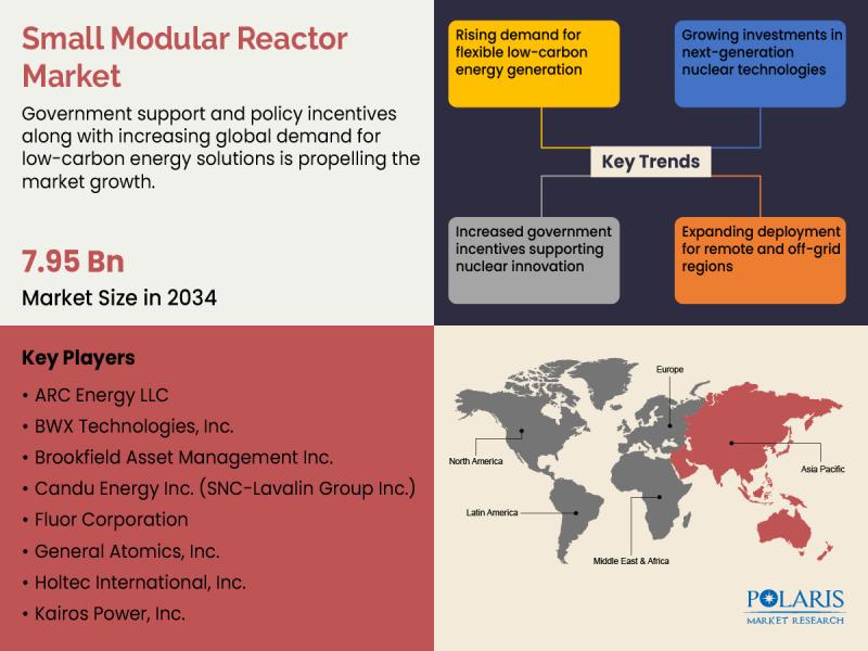 Global Small Modular Reactor Market is currently valued at USD 5.94 Billion in 2024 and is anticipated to generate an estimated revenue of USD 7.95 Billion by 2034, according to the latest study by Polaris Market Research. Besides, the report notes that the market exhibits a robust 2.97% Compound Annual Growth Rate (CAGR) over the forecasted timeframe, 2025 - 2034.