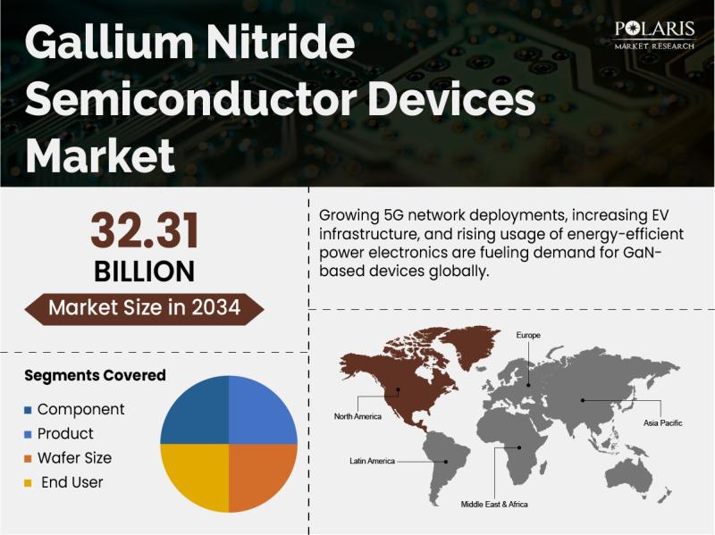 Global Gallium Nitride Semiconductor Devices Market is currently valued at USD 3.00 Billion in 2024 and is anticipated to generate an estimated revenue of USD 32.31 Billion by 2034, according to the latest study by Polaris Market Research. Besides, the report notes that the market exhibits a robust 26.8% Compound Annual Growth Rate (CAGR) over the forecasted timeframe, 2025 - 2034