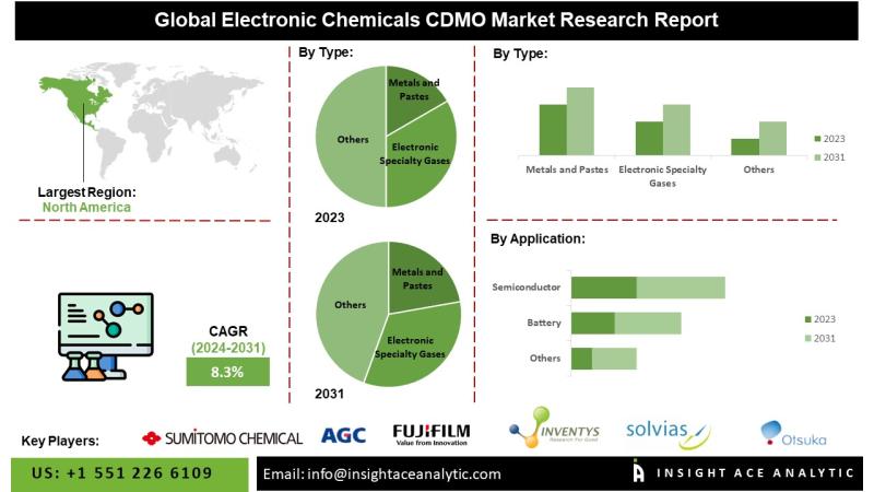 InsightAce Analytic Pvt. Ltd. announces the release of a market assessment report on the "Global Electronic Chemicals CDMO Market - (By Type (Metals and Pastes, Electronic Specialty Gases, Polymer Compounds, Others), By Application (Battery, Semiconductor, Integrated Circuit, Consumer Electronics, Others)), Trends, Industry Competition Analysis, Revenue and Forecast To 2034."