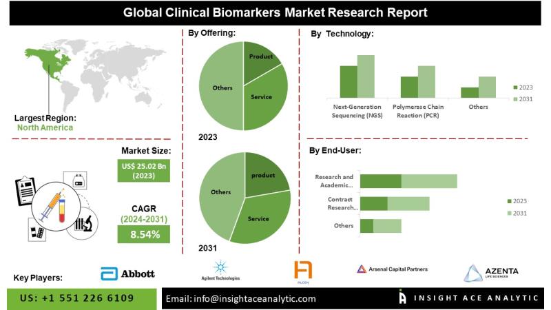 InsightAce Analytic Pvt. Ltd. announces the release of a market assessment report on the "Global Clinical Biomarkers Market - (By Offering (Product (Efficacy Biomarker (Diagnostic Biomarker, Predictive Biomarker, Prognostic Biomarker), Safety Biomarker, Validation Biomarker), Service (Genomic Biomarker Service, Tissue Biomarker Service, Cell Service, Proteomics Service), By Clinical Area (Cancer Biomarkers (Breast Cancer Biomarker, Lung Cancer Biomarker, Colorectal Cancer Biomarker, Prostate Cancer Biomarker, Other), Cardiac Biomarkers, Neurological Biomarkers, Infectious Disease, Immunological…