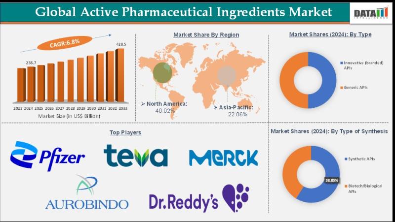 Active Pharmaceutical Ingredients (API) Market reached US$ 238.7 billion in 2024, rising from US$ 224.7 billion in 2023, and is expected to reach US$ 428.5 billion by 2033, growing at a CAGR of 6.8% during the forecast period 2025 to 2033.
