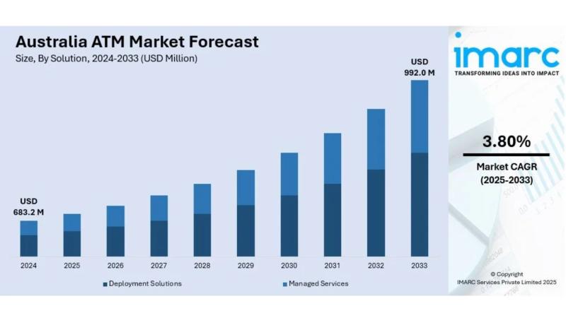 The latest report by IMARC Group, titled "Australia ATM Market: Industry Trends, Share, Size, Growth, Opportunity and Forecast 2025-2033," offers a comprehensive analysis of the Australia ATM market growth. The report also includes competitor and regional analysis, along with a breakdown of segments within the industry. The Australia ATM market size reached USD 683.2 Million in 2024. Looking forward, IMARC Group expects the market to reach USD 992.0 Million by 2033, exhibiting a growth rate (CAGR) of 3.80% during 2025-2033.Report Attributes: