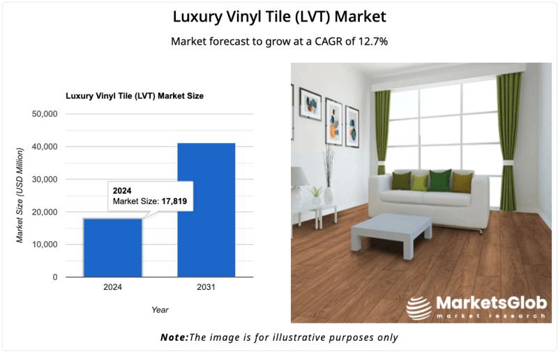 The global Luxury Vinyl Tile (LVT) Market size reached 17,819 USD Million in 2024. Looking forward, MarketsGlob expects the market to reach 41,148.19 USD Million by 2031, exhibiting a growth rate (CAGR) of 12.7% during 2025-2031.A recent report published by MarketsGlob offers an in-depth analysis of the Global Luxury Vinyl Tile (LVT) Market, projecting trends and market size through 2031. This comprehensive study serves as a valuable reference for industry professionals, including executives, analysts, and decision-makers. It provides quick and easy access to crucial insights on market dynamics, key growth factors, potential opportunities, and challenges ahead. Additionally, the report sheds light on the competitive landscape, helping stakeholders stay informed and make strategic decisions.