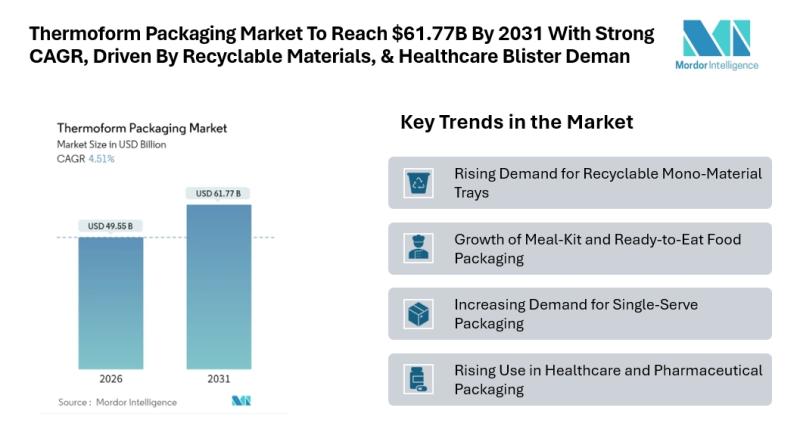 According to Mordor Intelligence, the thermoform packaging market size is estimated at USD 49.55 billion in 2026, growing from USD 47.41 billion in 2025 and projected to reach USD 61.77 billion by 2031, registering a CAGR of 4.51% during the forecast period. This…