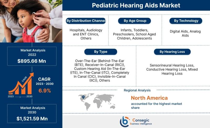 The Pediatric Hearing Aids Market encompasses the manufacturing, distribution, and sale of hearing aids specifically designed and tailored for infants, children, and adolescents with hearing loss. These devices are intended to amplify sound, enabling children to hear more clearly and improve their speech and language development. Key components of this market include various types of hearing aids, such as Behind-the-Ear (BTE), Receiver-in-Canal (RIC), and custom-made devices like In-the-Ear (ITE) and In-the-Canal (ITC) aids. Related services, such as audiological evaluations, fitting and programming of hearing aids, and ongoing support and maintenance, are also integral to the market. Key terms within this market include: