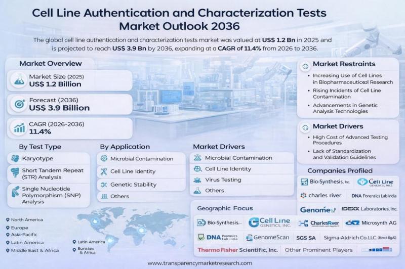 The global cell line authentication and characterization tests market was valued at US$ 1.2 Billion in 2025 and is projected to reach US$ 3.9 Billion by 2036, expanding at a robust CAGR of 11.4% from 2026 to 2036. The market is witnessing accelerated growth due to the rising incidences of cell line misidentification, increasing regulatory scrutiny, and the rapid expansion of personalized medicine and cell-based therapies across the biopharmaceutical and…