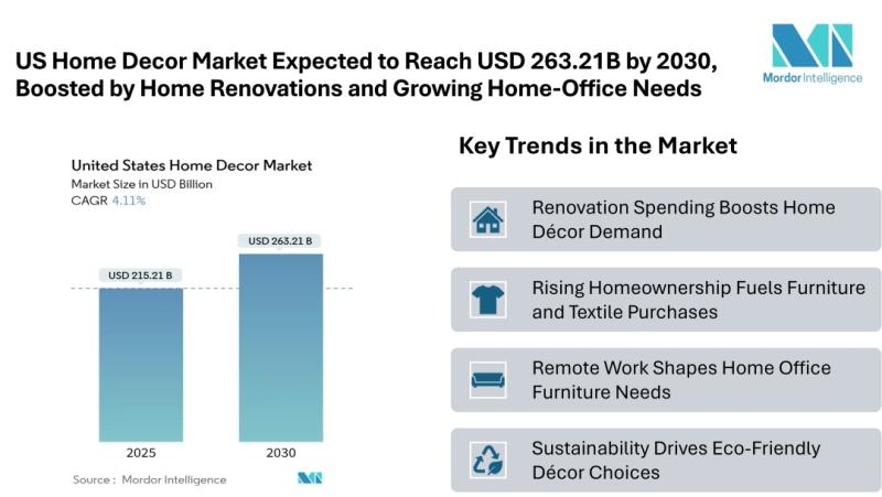According to Mordor Intelligence, the United States Home Decor Market size [https://www.mordorintelligence.com/industry-reports/us-home-decor-market?utm_source=abnewswire] is estimated at USD 215.21 billion in 2025, and is expected to reach USD 263.21 billion by 2030, at a CAGR of 4.11% during the forecast period (2025-2030).