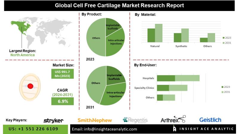 InsightAce Analytic Pvt. Ltd. announces the release of a market assessment report on the "Global Cell-Free Cartilage Repair Market - (By Product (Implantable scaffolds, Intra-articular injections), By Material (Natural (Collagen-Based, Hyaluronic Acid-Based, Chitosan-Based, ECM (Extracellular Matrix), Others), Synthetic (Polyglycolic Acid, Others (Aragonite)), Combination), By Application (Hip, Ankle, Shoulder, Elbow, Knee), By Indication (Osteoarthritis, Sports injury, Trauma, Others), By End-user (Hospitals, Specialty Clinics, Ambulatory Surgical Centers, Regenerative Medicine Centers, Academic And…
