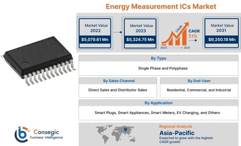 The Energy Measurement ICs Market size is estimated to reach over USD 9,250.18 Million by 2031 from a value of USD 5,079.61 Million in 2022. It is projected to grow by USD 5,324.75 Million in 2023, growing at a CAGR of 7.1% from 2023 to 2031.