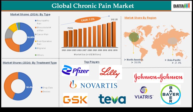 Chronic Pain Market reached US$ 79.96 Billion in 2024 and is expected to reach US$ 142.28 Billion by 2033, growing at a CAGR of 7.5 % during the forecast period 2025-2033.The latest Chronic Pain Market Report by DataM Intelligence offers a clear analysis of global trends, market size, key players, and growth drivers. Covering emerging technologies, evolving care models, and regulatory insights, it provides strategic intelligence to help stakeholders navigate the dynamic healthcare landscape through 2025-2033