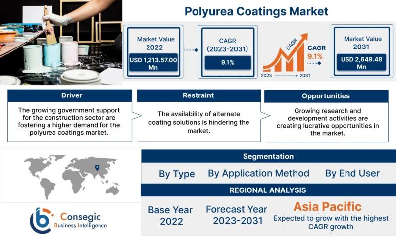The polyurea coatings market was valued at USD 1,213.57 million in 2022 and USD 1,318.35 million in 2023. It is projected to reach USD 2,649.48 Million by 2031, growing at a CAGR of 9.1% during the forecast period (2023-2031).