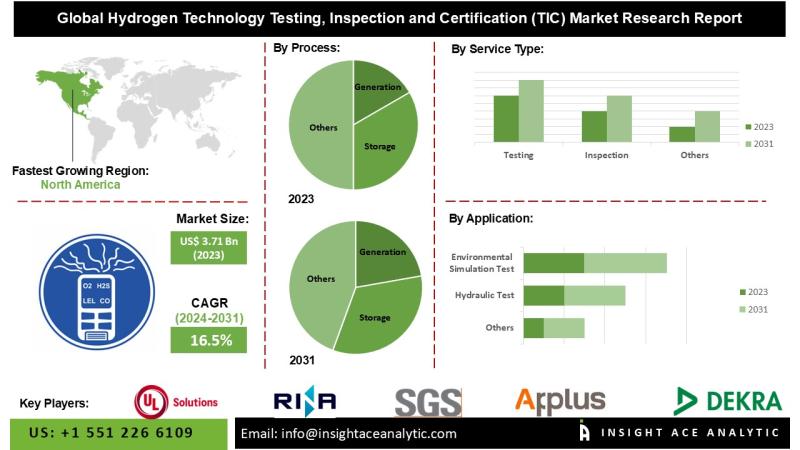 InsightAce Analytic Pvt. Ltd. announces the release of a market assessment report on the "Global Hydrogen Technology Testing, Inspection and Certification (TIC) Market - (By Process Generation (Gray Hydrogen, Blue Hydrogen, Green Hydrogen, Others), Storage (Physical, Material-Based), Transportation/Distribution (Long-Distance, Short-Distance), By Application (Refining & Chemicals, Mobility, Energy, Others), By Service Type (Testing, Inspection, Certification, Other Services), By Testing Type (Pressure Cycle, Leakage, and Tightness Test, Overpressure, Burst, and Flow Test,…