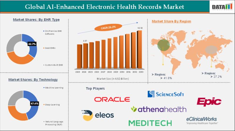 As per DataM Intelligence research report, "The Global AI-Enhanced Electronic Health Records Market reached US$ 6.57 billion in 2024 and is expected to reach US$ 52.50 billion by 2033, growing at a CAGR of 26.2% during the forecast period 2025-2033." Increasing adoption of AI-driven clinical decision support and rising demand for automated healthcare workflows are fueling market growth.