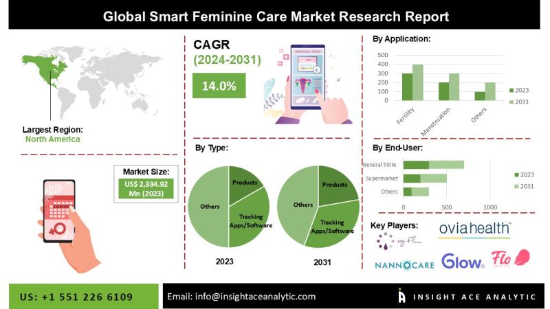 InsightAce Analytic Pvt. Ltd. announces the release of a market assessment report on the "Global Smart Feminine Care Market- by Types (Products (Smart Tampons, Smart Menstrual Pads, Smart Menstrual Cups, and Fertility/Ovulation monitoring Devices/Bands) and Tracking Apps/Software), Applications (Fertility, and Other Applications), End-Users (Supermarket, General Store, Retail Pharmacies, and E-Commerce Platforms), Trends, Industry Competition Analysis, Revenue and Forecast To 2034."According to the latest research by InsightAce Analytic, the global Smart Feminine Care market is valued at USD 2.63 Billion in 2024, and it is expected to reach USD 9.85 Billion by the year 2034 with a CAGR of 14.2% during a forecast period of 2025-2034.