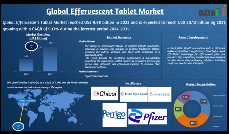 The Global Effervescent Tablet Market size reached US$ 9.98 billion in 2023 and is expected to reach US$ 20.13 billion by 2031, growing with a CAGR of 9.17% during the forecast period 2024-2031.