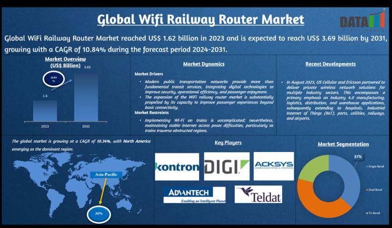 As per DataM intelligence research report" Global WiFi Railway Router Market reached US$ 1.62 billion in 2023 and is expected to reach US$ 3.69 billion by 2031, growing with a CAGR of 10.84% during the forecast period 2024-2031." Smart transportation systems and always-connected passenger experiences are increasing adoption of WiFi railway routers.