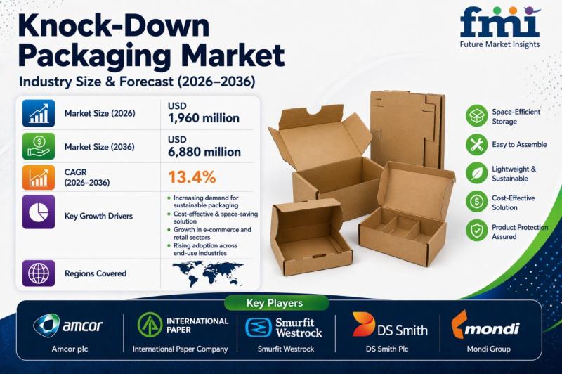 According to latest insights by Future Market Insights, the global knock-down packaging market is projected to grow from USD 1,960 million in 2026 to USD 6,880 million by 2036, expanding at a CAGR of 13.4%. Growth is primarily driven by rising freight costs, increasing demand for space-efficient packaging, and regulatory mandates promoting recyclability and reduced packaging volume.