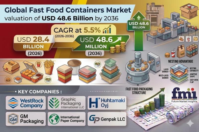 According to latest insights by Future Market Insights, the global fast food containers market is projected to grow from USD 28.4 billion in 2026 to USD 48.6 billion by 2036, expanding at a CAGR of 5.5%. Growth is primarily driven by the rapid expansion of food delivery services, which require packaging solutions engineered for thermal retention, durability, and leak resistance during transit.