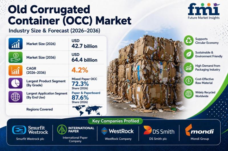 According to latest insights by Future Market Insights, the global Old Corrugated Container (OCC) market is projected to grow from USD 42.7 billion in 2026 to USD 64.4 billion by 2036, expanding at a CAGR of 4.2%. Growth is driven by rising demand for recycled fiber in containerboard production, increasing e-commerce packaging volumes, and strong regulatory emphasis on circular economy practices.