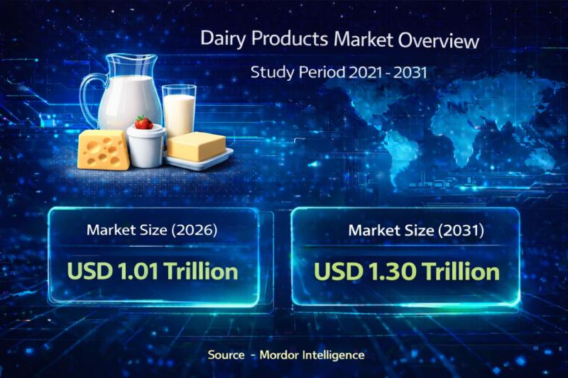 According to a research report by Mordor Intelligence, the global dairy products market size [https://www.mordorintelligence.com/industry-reports/dairy-products-market?utm_source=abnewswire] is valued at USD 1.01 trillion in 2026 and is projected to reach USD 1.30 trillion by 2031, registering a CAGR of 5.09%…