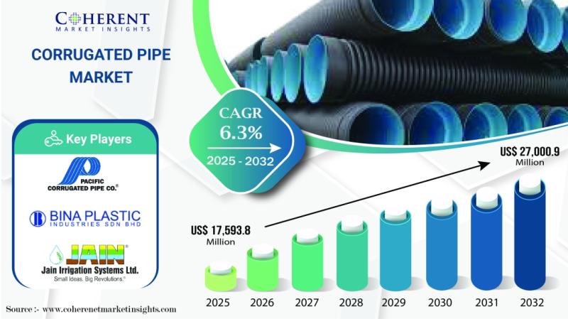 According to Coherent Market Insights (CMI), the global corrugated pipe market [https://www.coherentmarketinsights.com/industry-reports/corrugated-pipe-market] is estimated to be valued at USD 17,593.8 Mn in 2025 and is expected to reach USD 27,000.9 Mn by 2032, exhibiting a compound annual growth rate (CAGR) of 6.3% from 2025 to 2032.The global corrugated pipe market is experiencing significant growth, driven by rising investments in wastewater management and transportation infrastructure projects across both developed and developing regions. A key market trend is the increasing demand for sustainable infrastructure materials. Modern corrugated pipes, made from steel and plastic, offer enhanced durability and longer lifespans compared to traditional alternatives, further boosting their adoption.Request Sample Pages: https://www.coherentmarketinsights.com/insight/request-sample/7040