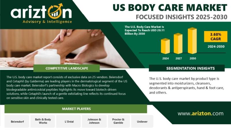Industry Analysis Report, Regional Outlook, Growth Potential, Price Trends, Competitive Market Share & Forecast 2025-2030.According to Arizton's latest research report, the U.S. body care market [https://www.arizton.com/market-reports/us-body-care-market] is projected to grow at a CAGR of 3.68% from 2024 to 2030, reaching USD 20.11 billion by 2030.