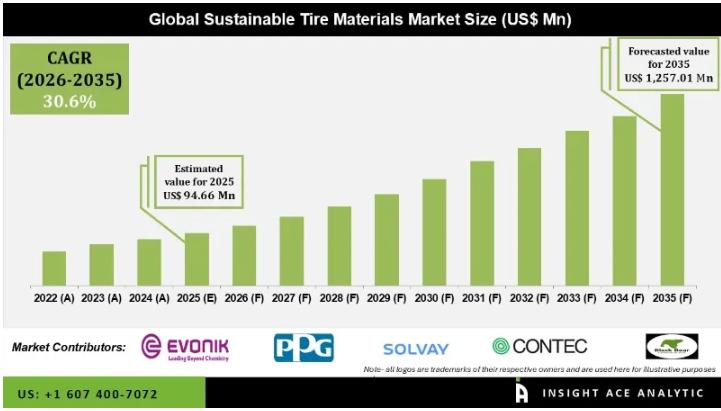 InsightAce Analytic Pvt. Ltd. announces the release of a market assessment report on the "Global Sustainable Tire Materials Market- (By Type of Material (Rubber (Natural, Recycled), Sustainable Carbon Black, Silica, Others), By Propulsion Type (Internal Combustion Engine Vehicles, Electric Vehicles), By Vehicle Type, (Passenger Vehicles, Commercial Vehicles), By Tire Structure (Radial, Bias), By Sales Channel (OEMs, Aftermarket)), Trends, Industry Competition Analysis, Revenue and Forecast To 2035."