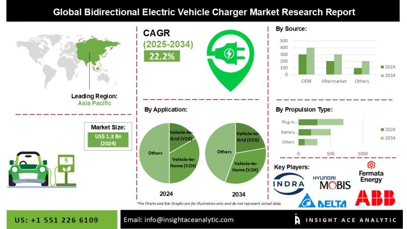 InsightAce Analytic Pvt. Ltd. announces the release of a market assessment report on the "Global Bidirectional Electric Vehicle Charger Market Size, Share & Trends Analysis Report By Application (Vehicle-to-Grid (V2G), Vehicle-to-Home (V2H), and Others (Vehicle-to-Vehicle and Vehicle-to-Load)), Source (OEM and aftermarket), Propulsion Type (Battery Electric Vehicle (BEV) and Plug-in Hybrid Electric Vehicles (PHEV)), Charging Type (100 kWh) And Deployment Of Chargers (Domestic And Commercial)- Market Outlook And Industry Analysis 2034"