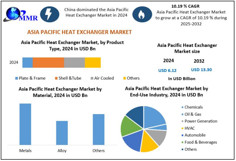 According to a new report by Maximize Market Research, the Asia Pacific Heat Exchanger Market was valued at USD 6.12 Billion in 2024 and is projected to reach USD 13.30 Billion by 2032, growing at a CAGR of 10.19%. The market growth is fueled by increasing industrial activities, energy efficiency initiatives, and demand from power generation, chemical, and HVACR sectors across the region.