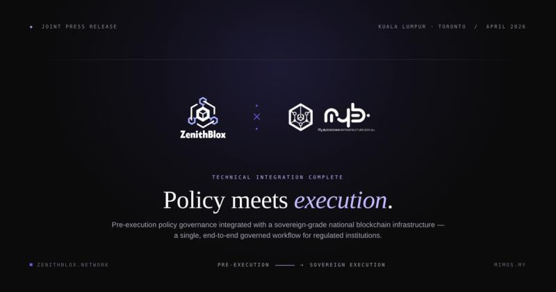 ZenithBlox Inc. and My Blockchain Infrastructure Sdn. Bhd. (MBISB), the entity behind Malaysia's national blockchain initiative, today announced the successful completion of a full technical integration between Malaysia Blockchain Infrastructure (MBI) and ZenithBlox's Compliance-Orchestrated Blockchain Infrastructure (COBI) platform.
