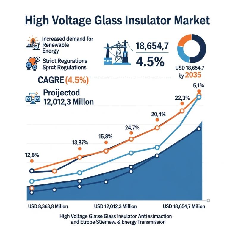 The global High Voltage Glass Insulator Market is projected for substantial expansion over the next decade, driven by an escalating demand in power transmission and distribution applications worldwide. Valued at USD 8,363.8 million in 2023, the market is set to reach USD 12,012.3 million by 2025, demonstrating a robust compound annual growth rate (CAGR) of 4.5% from 2025 to 2035. This trajectory is expected to culminate in a market valuation of approximately USD 18,654.7 million by 2035. This growth underscores a critical global shift towards modernizing aging electrical infrastructure, integrating renewable energy, and ensuring reliable power delivery.Browse full Report Here: https://www.futuremarketinsights.com/reports/hv-glass-insulator-market