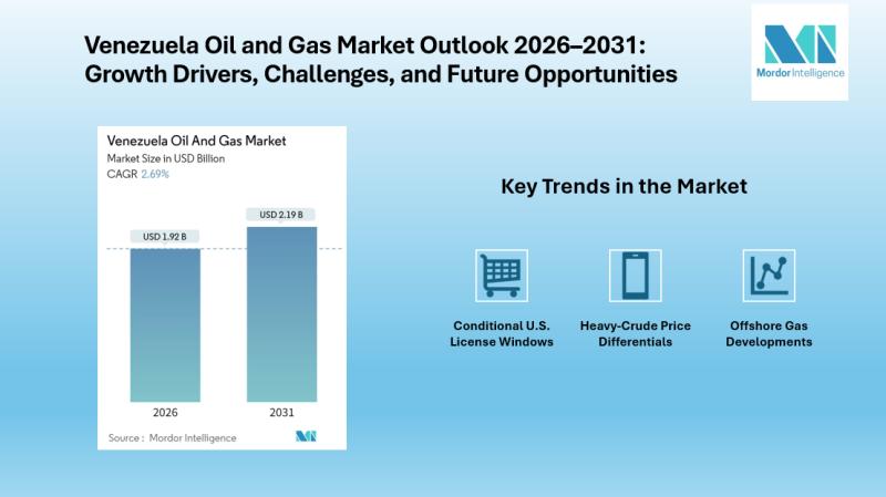 The Venezuela Oil and Gas Market is projected to grow from USD 1.92 billion in 2026 to USD 2.19 billion by 2031, registering a CAGR of 2.69%. Key growth drivers include offshore gas discoveries, heavy-crude price spreads, and selective U.S. license windows, while challenges such as sanctions, under-investment, and infrastructure gaps continue to weigh on the sector