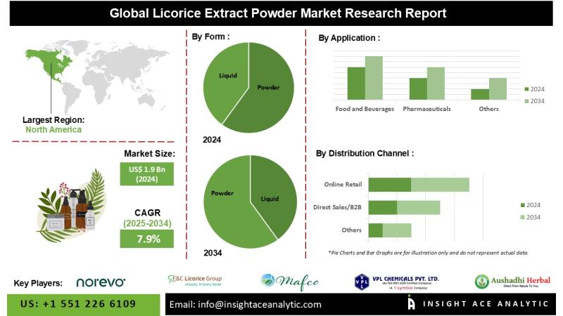 InsightAce Analytic Pvt. Ltd. announces the release of a market assessment report on the "Global Licorice Extract Powder Market- (By Application: Food and Beverages, Pharmaceuticals, Cosmetics and Personal Care; By Form, By Distribution Channel), By Region, Trends, Industry Competition Analysis, Revenue and Forecast To 2034."According to the latest research by InsightAce Analytic, the Global Licorice Extract Powder Market is valued at USD 1.9 Bn in 2024, and it is expected to reach USD 4.0 Bn by 2034, with a CAGR of 7.9% during the forecast period of 2025-2034.