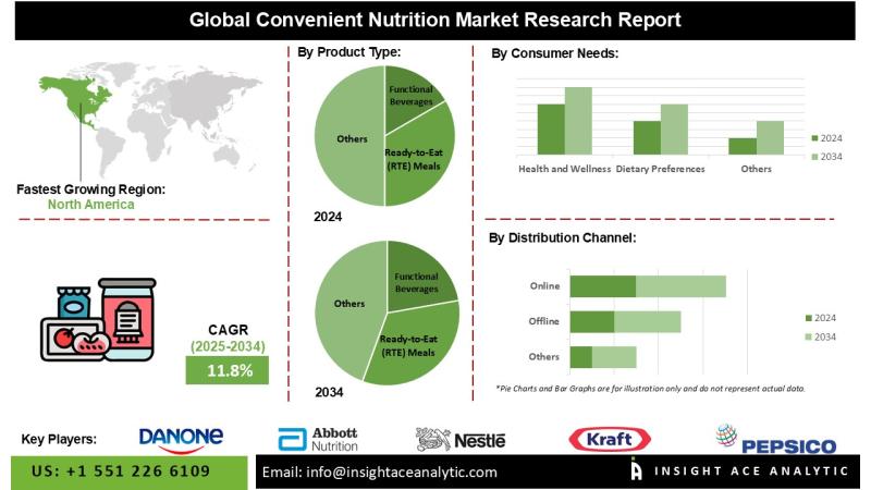 InsightAce Analytic Pvt. Ltd. announces the release of a market assessment report on the "Convenient Nutrition Market"-, By Product Type (Ready-to-Eat (RTE) Meals, Healthy Snacks, Functional Beverages, Dietary Supplements, Personalized Nutrition Products, Kids' Nutrition Products, Sports Nutrition, Others), By Consumer Needs(Health and Wellness, Dietary, Preferences, Convenience and Portability, Preventive Healthcare, Personalized Solutions), By Distribution Channel (Online, Offline), and Global Forecasts, 2025-2034 And Segment Revenue and Forecast To 2034."Globsl Convenient Nutrition Market Size is predicted to develop a 11.8% CAGR during the forecast period for 2025-2034.