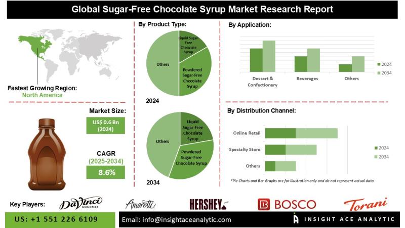 InsightAce Analytic Pvt. Ltd. announces the release of a market assessment report on the "Global Sugar-Free Chocolate Syrup Market - By Product Type (Liquid Sugar-Free Chocolate Syrup and Powdered Sugar-Free Chocolate Syrup), By Application (Dessert & Confectionery, Beverages, Bakery, Others), By Distribution Channel (Online Retail, Supermarkets & Hypermarkets, Specialty Stores, Convenience Stores), Trends, Industry Competition Analysis, Revenue And Forecast To 2034."The global Sugar-Free Chocolate Syrup market is estimated to reach over USD 1.3 Bn by the year 2034, exhibiting a CAGR of 8.6% during the forecast period.