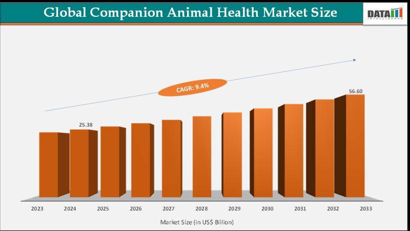 The Global Companion Animal Health Market reached US$ 25.38 billion in 2024 and is expected to reach US$ 56.60 billion by 2033, growing at a CAGR of 9.4% during 2025-2033.