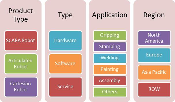 This study provides an overview of the global Automotive Robotics industry, tracking market segments across the categorized four geographic regions. The report provides a five-year forecast for the market size in terms of value for North America, Europe, Asia-Pacific, and Rest of the world. The scope of the study segments the global automotive Robotics market based on product type, type, and application.