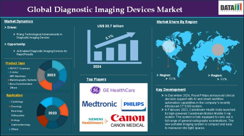The Global Diagnostic Imaging Devices Market reached US$ 33.7 billion in 2024 and is expected to reach US$ 52.6 billion by 2033, growing at a CAGR of 5.1% during the forecast period 2025-2033.